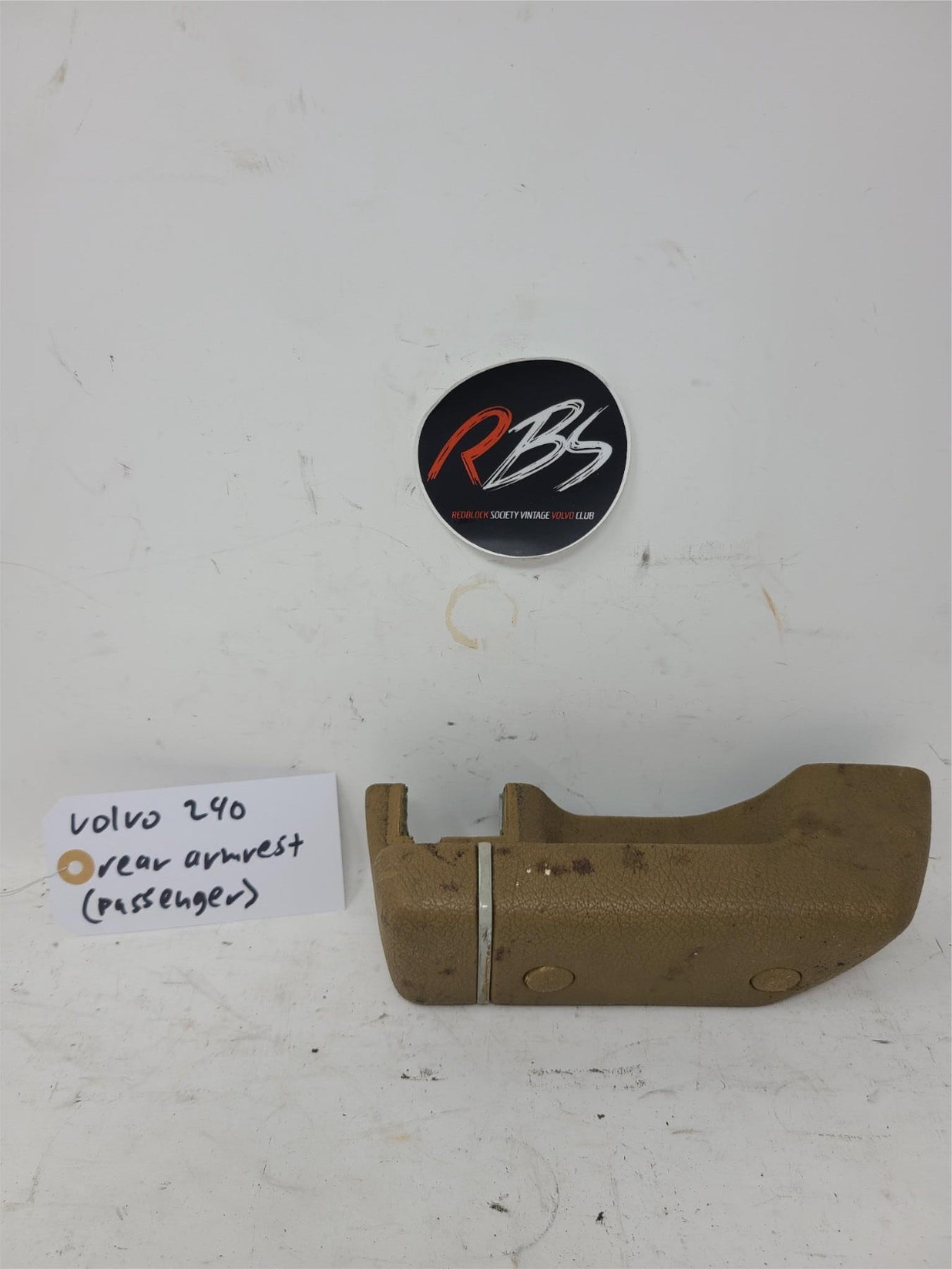 This listing is for a genuine Volvo 240 rear passenger-side armrest in tan color.