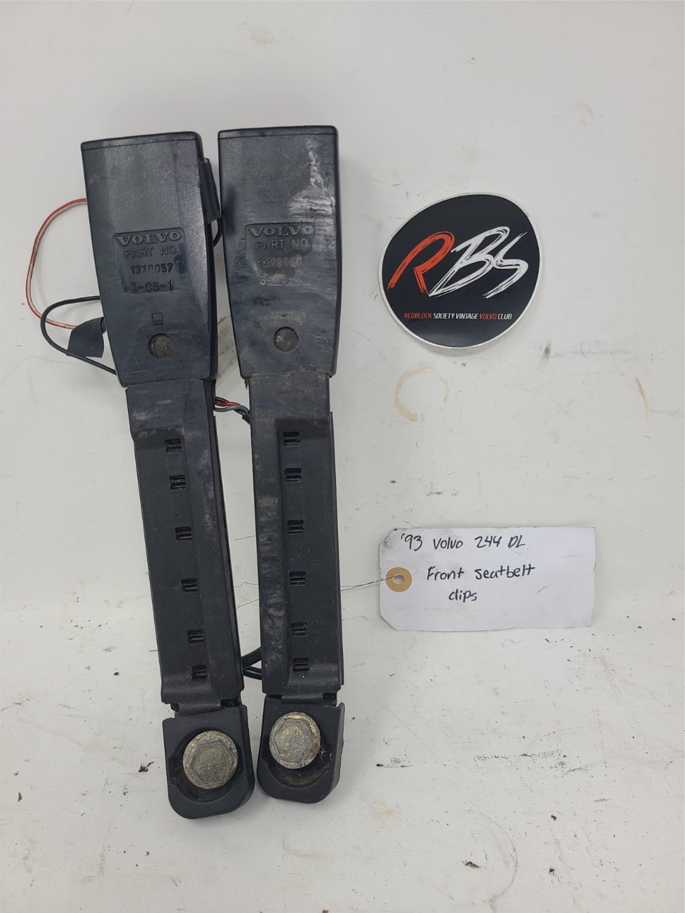 This is a pair of genuine Volvo OEM front seat belt buckle receivers, removed from a 1993 Volvo 244 DL.